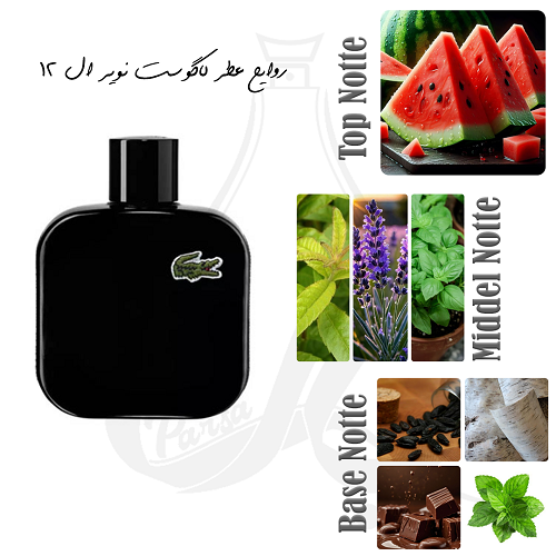 عطر لاگوست ال. 12. 12 نویر(مشکی) LACOSTE - L.12.12. Noir، محصول ۲۰۱۳، رایحهای ملایم و شیرین برای آقایان است. شروعی میوهای با بوی واضح هندوانه، میانهای گیاهی و گلدار و پایانی شکلاتی-دودی.بهترین انتخاب برای شبهای پاییزی و استفاده روزمره آقایان که دنبال سبک کلاسیک و دلنشیناند.